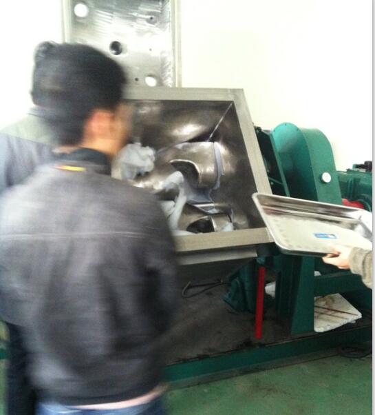 高檔硅橡膠用戶生產(chǎn)現(xiàn)場(chǎng)圖,該機(jī)采用液壓翻轉(zhuǎn)出料方式,翻轉(zhuǎn)角度大,出料干凈